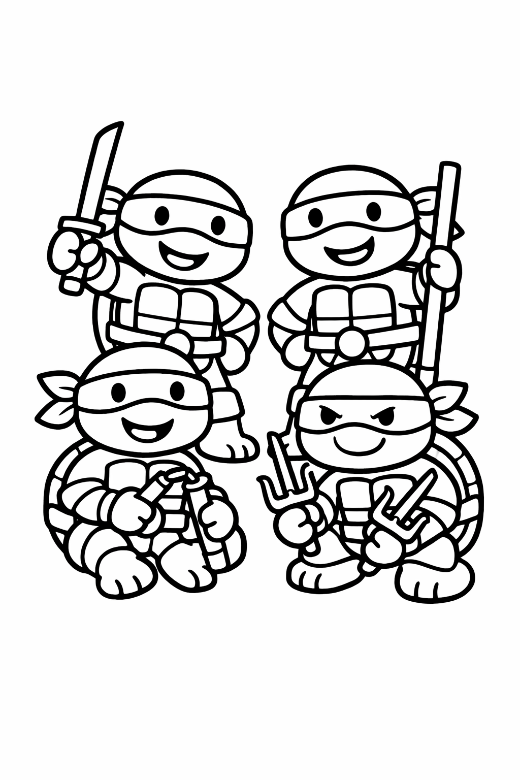 Przygotuj kredki i zanurz się w świecie Wojowniczych Żółwi Ninja! Na tej prostej kolorowance może znajdować się jeden z walecznych bohaterów lub cała drużyna gotowa do nowej przygody. Specjalnie dla najmłodszych, ilustracja posiada grube i wyraźne kontury, które ułatwiają precyzyjne kolorowanie bez wychodzenia za linie. Kolorowanka jest od razu gotowa do wydruku, dzięki czemu zabawa może zacząć się w każdej chwili. Prosty wzór sprawia, że jest to idealna propozycja dla przedszkolaków, ale spodoba się także starszym dzieciom, które uwielbiają tych niezwykłych bohaterów.